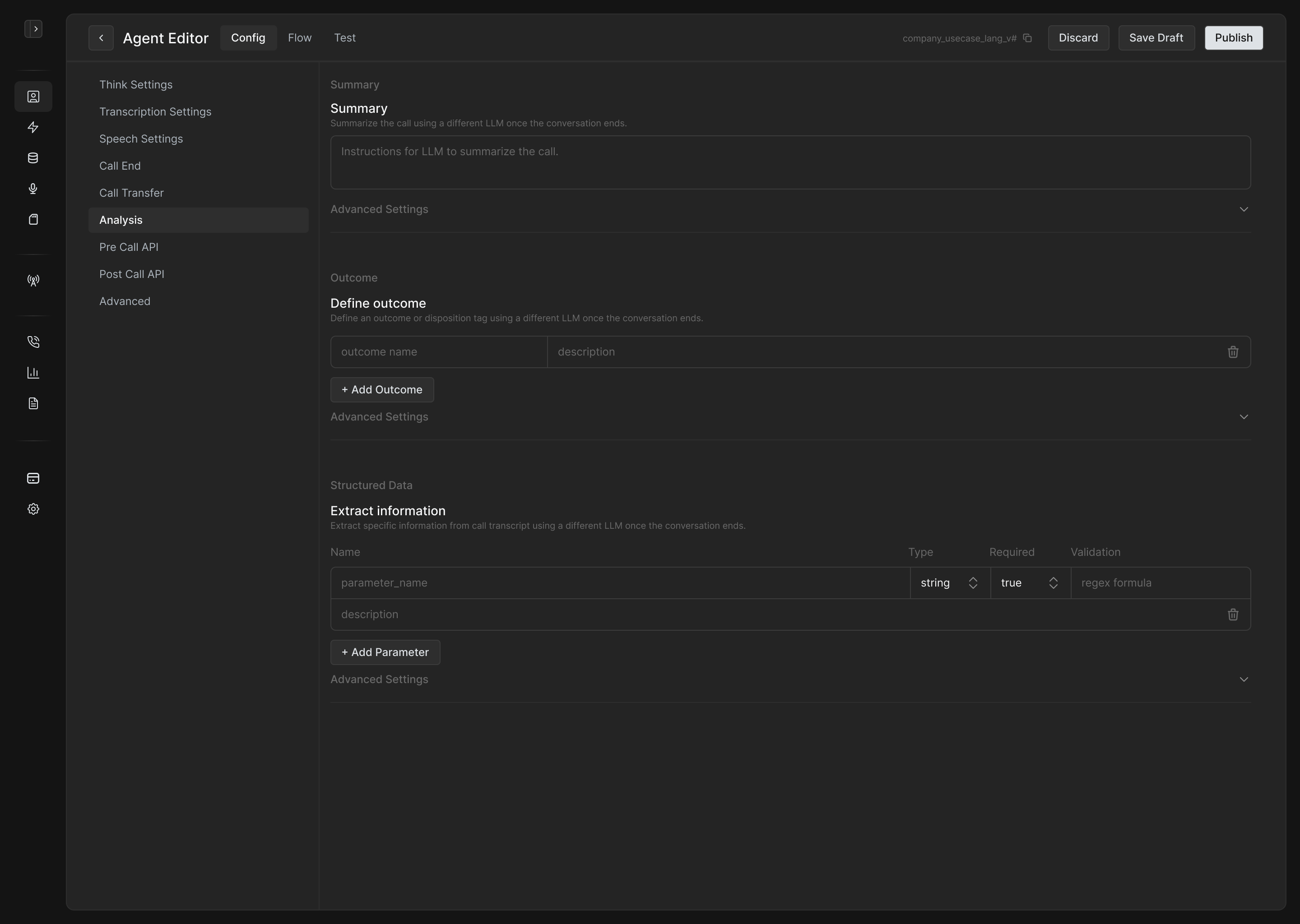 This feature enables automated analysis of the call transcript once a conversation ends. Dedicated LLMs process the call transcript and generates valuable insights across three main segments.