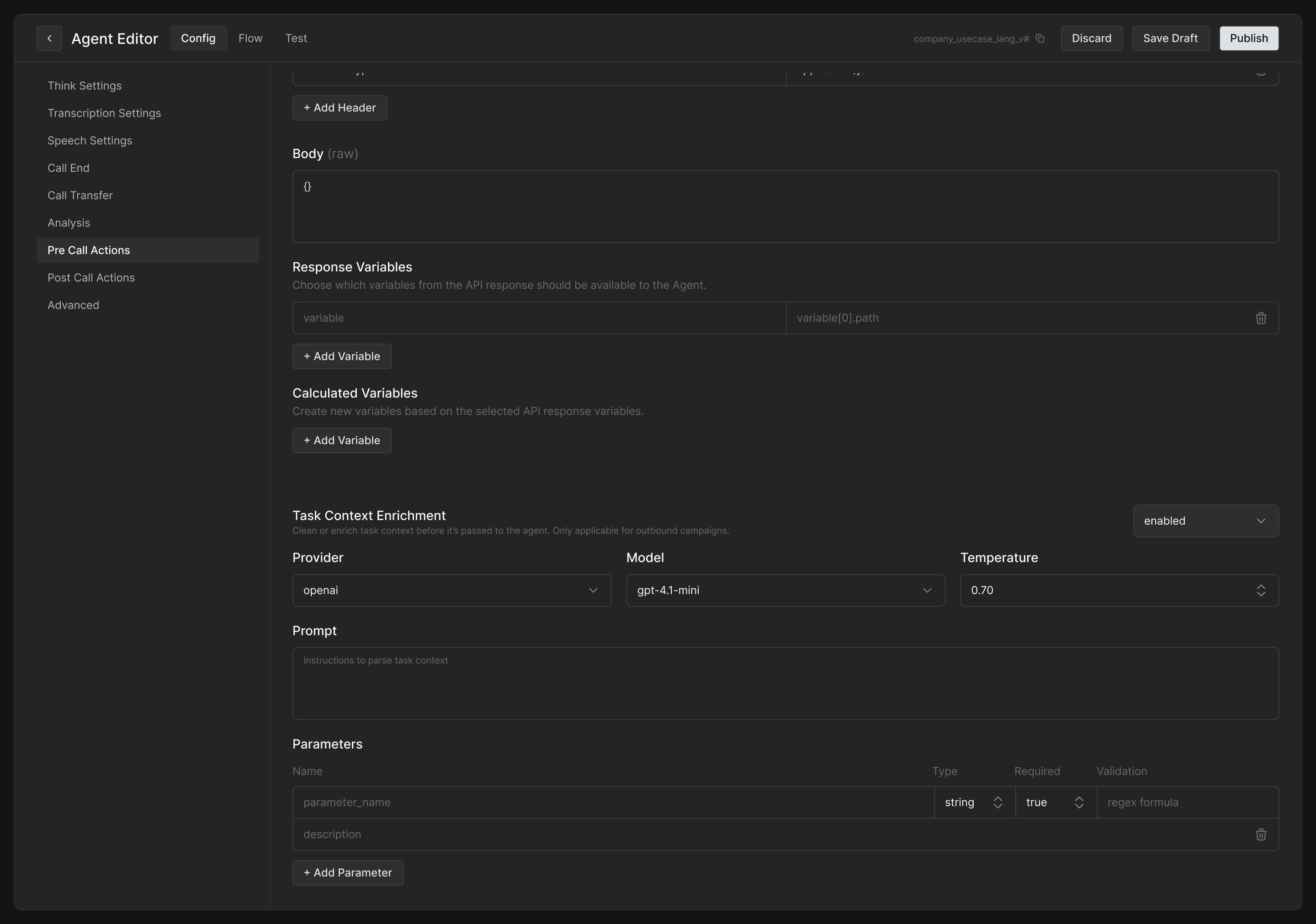 This feature allows you to enrich and transform your task context before it is provided to the agent. Typically used to clean real world messy data into a clean, speech ready format for agent to use.