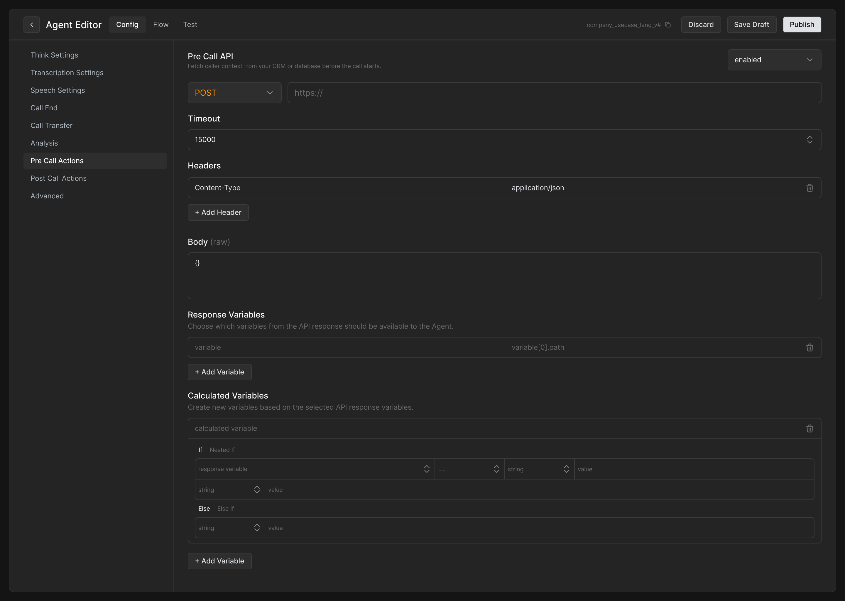 This endpoint enables your agent to fetch contextual information from a CRM or internal database at the start of a call. It’s typically used to: